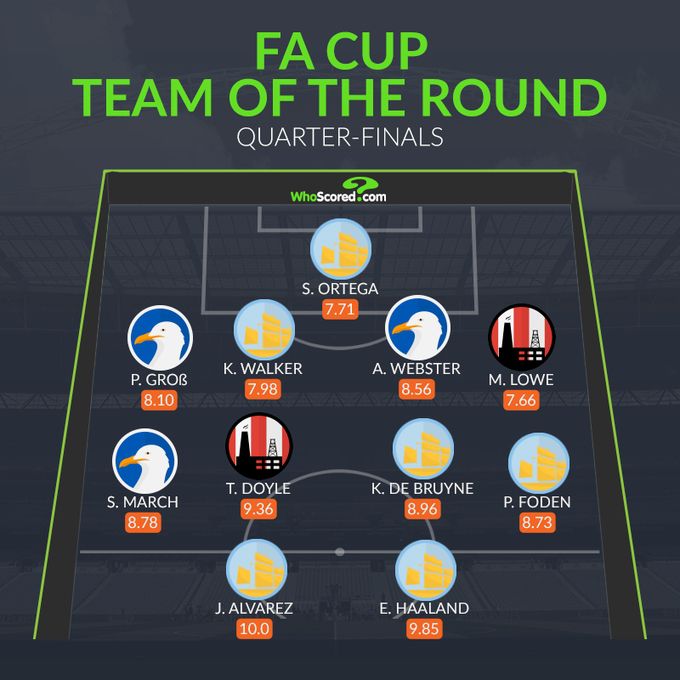 玩球网3月21日讯 日前,足总杯1/4决赛已经结束,数据网站Whoscored也评选出了本轮足总杯的最佳阵容,具体如下: 门将:奥尔特加(曼城) 后卫:格罗斯(布莱顿)、凯尔-沃克(曼城)、韦伯斯特(布莱顿)、马克斯-洛(谢菲尔德联) 中场:马奇(布莱顿)、汤米-多伊尔(谢菲尔德联)、德布劳内(曼城)、福登(曼城) 前锋:阿尔瓦雷斯(曼城)、哈兰德(曼城) (JayChan) |
