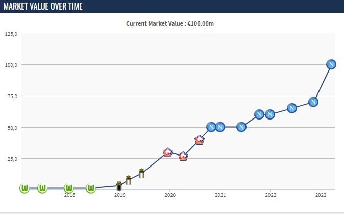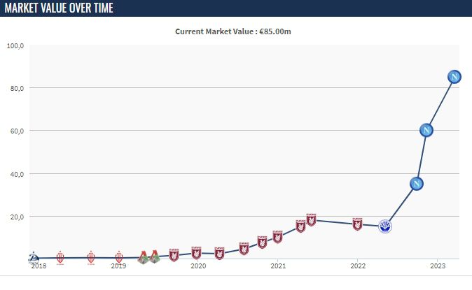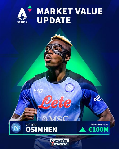 那不勒斯本赛季暂19分领跑意甲并进入了欧冠8强,今日德国转会市场更新部分意甲球员身价,那不勒斯前锋奥斯梅恩身价涨至1亿欧。奥斯梅恩本赛季出场29次,25球5助。而奥斯梅恩的队友克瓦拉茨赫利亚的身价涨至