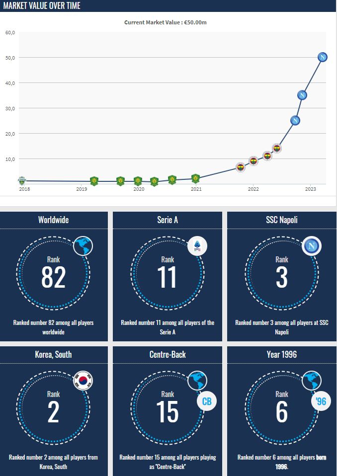 玩球网3月21日讯今日德转更新意甲球员身价,效力于那不勒斯的26岁韩国中卫金玟哉身价暴涨至5000万欧,目前在韩国球员中排名第二,仅次于孙兴慜的6000万欧。金玟哉本赛季是那不勒斯阵中的绝对主力,为球