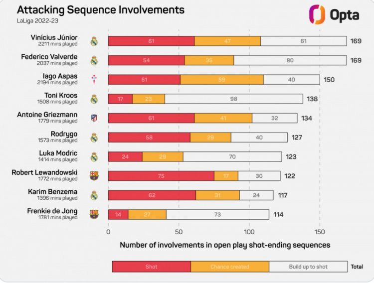 玩球网3月22日讯Opta统计了本赛季球员在西甲参与有效进攻(以射门告终)的次数,并列出榜单,维尼修斯和巴尔韦德并列居首,前10名球员中皇马占6席。本赛季西甲运动战参与有效进攻榜:维尼修斯(皇马)——