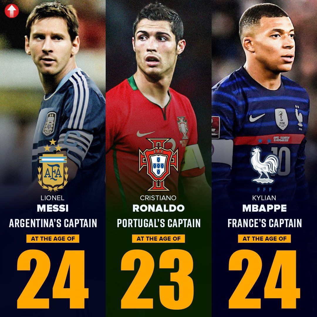 24岁的姆巴佩出任法国国家队新任队长。梅西在24岁时成为阿根廷队长,C罗在23岁时成为葡萄牙队长。