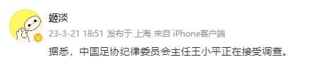 昨晚,多位媒体人在社媒发文暗示:中国足协纪律委员会主任王小平正在接受调查,涉事方面据称与李铁案有关。媒体人徐江发文,并在评论区表示:书法家????(注:王小平作为纪律委员会主任,为足协罚单签字,被球迷戏称为