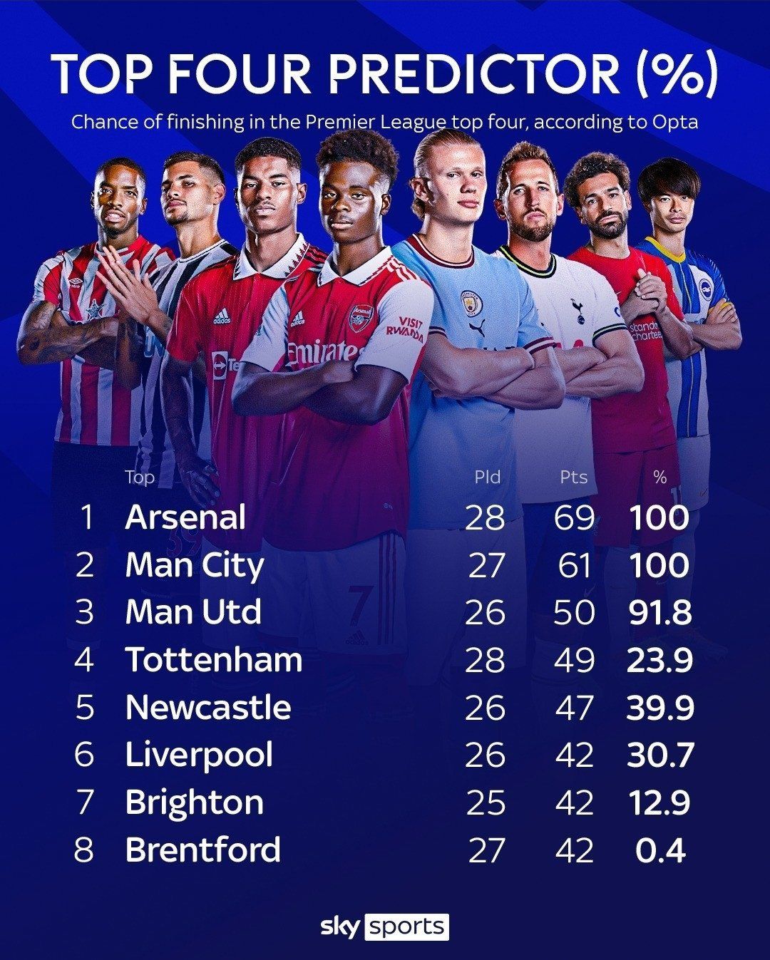 玩球网3月22日讯国际比赛日到来,各大联赛进入了休赛期。天空体育预测了本赛季英超球队获得前四的概率,枪城两队百分百,曼联91.8%第三。纽卡利物浦热刺紧随其后。切尔西不足0.4%不在榜上。 预测详情: 1、阿森纳 28场69分 100% 2、曼城 27场61分 100% 3、曼联 26场50分 91.8% 4、热刺 28场49分 23.9% 5、纽卡 26场47分 39.9% 6、利物浦 26场42分 30.7% 7、布莱顿 25场42分 12.9% 8、布伦特福德 27场42分 0.4% |