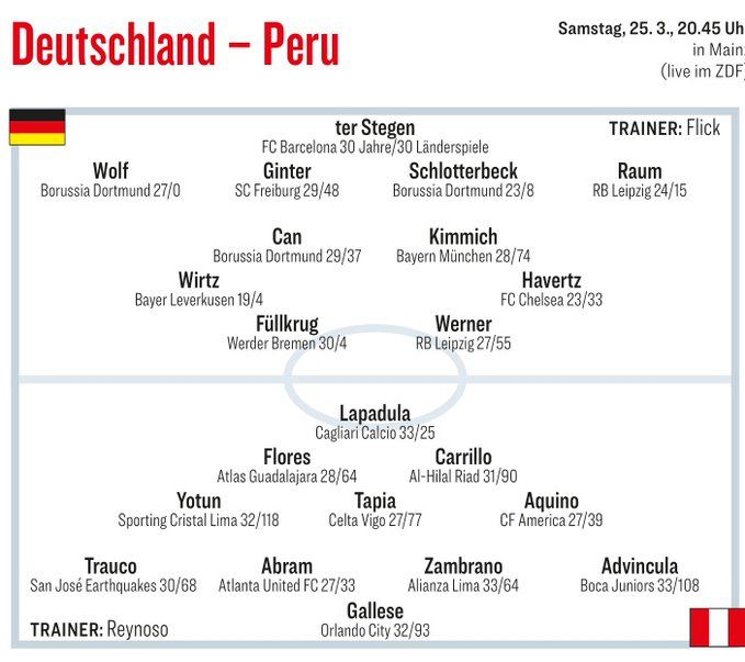 玩球网3月23日讯北京时间3月26日凌晨3:45,德国队将与秘鲁队进行一场友谊赛。赛前,《踢球者》预测了德国队的首发阵容,领衔锋线的是莱比锡攻击手维尔纳。《踢球者》预测德国队具体首发阵容如下:门将:特