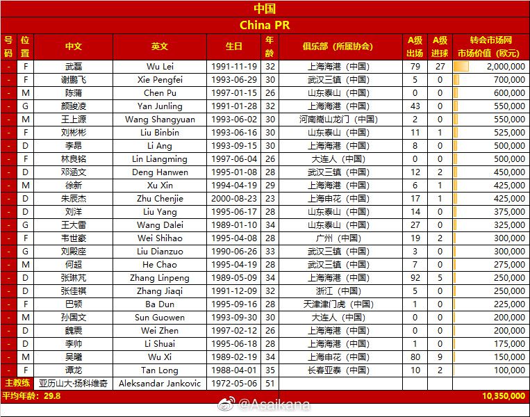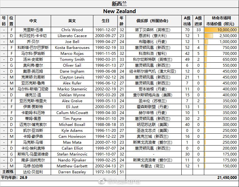 中国国家队vs新西兰国家队球员一览(附身价)新西兰国家队虽然国际排名比中国低20多位,但总身价是中国的2倍还多。其中在英超诺丁汉森林效力的头号球星克里斯·伍德一个人身价就几乎抵得上国足全队。伍德在20