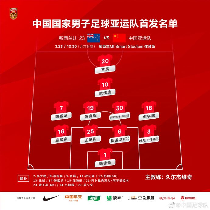 玩球网3月23日讯10:30,亚运男足将迎战U23新西兰。亚运男足公布首发阵容,阵型为4-4-1-1。亚运男足首发:1-韩佳奇、16-温家宝、25-王献钧、6-蒋圣龙、3-叶力江-什那尔、7-陶强龙、