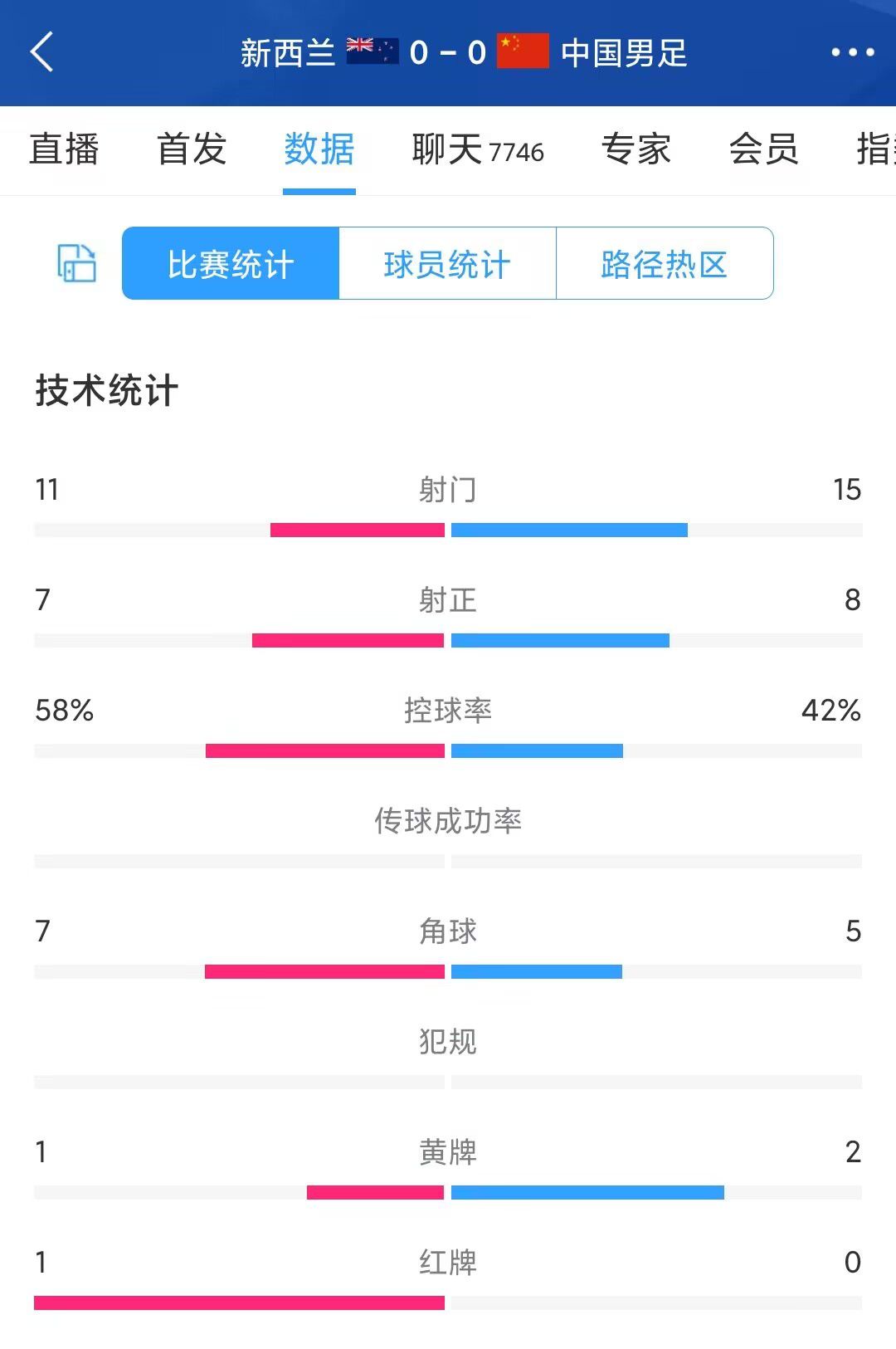 玩球网3月23日讯友谊赛,国足0-0战平新西兰,双方全场数据↓新西兰(左)-国足(右)控球率58%-42%射门11-15射正7-8