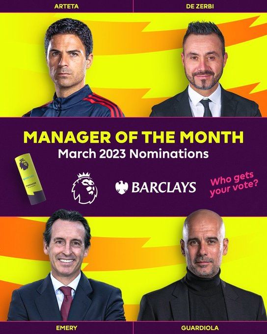 玩球网3月23日讯英超联赛公布了3月最佳教练的候选名单,阿尔特塔、德泽尔比、埃梅里、瓜迪奥拉四人入选。阿尔特塔(阿森纳):4战4胜,本赛季已经3次当选月最佳教练德泽尔比(布莱顿):2胜1平埃梅里(维拉