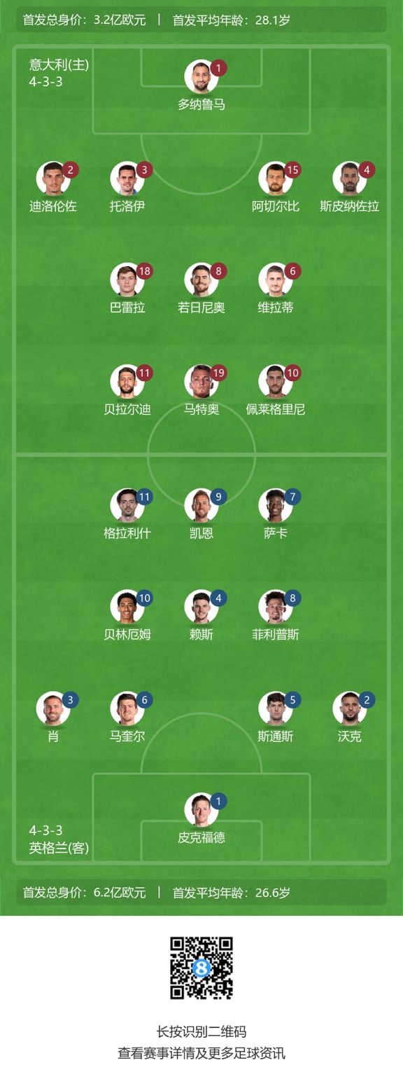 玩球网3月24日讯 北京时间03:45,欧洲杯预选赛C组,意大利vs英格兰,赛前首发名单公布。 英格兰首发:1-皮克福德、2-沃克、3-卢克-肖、5-斯通斯、6-马奎尔、4-赖斯、8-菲利普斯、10-贝林厄姆、11-格拉利什、7-萨卡、9-凯恩 英格兰替补:12-特里皮尔、13-拉姆斯代尔、14-亨德森、15-戴尔、16-奇尔维尔、17-詹姆斯、18-格伊、19-加拉格尔、20-福登、21-麦迪逊、22-福斯特、23-伊万-托尼 意大利首发:1-多纳鲁马、2-迪-洛伦佐、15-阿切尔比、3-托洛伊、4-斯皮纳佐拉、18-巴雷拉、8-若日尼奥、6-维拉蒂、11-贝拉尔迪、19-雷特吉、10-佩莱格里尼 意大利替补:21-法尔科内、22-梅雷特、5-达米安、7-格诺托、9-斯卡马卡、12-佩西纳、13-埃莫森、14-斯卡尔维尼、16-克里斯坦特、17-波利塔诺、20-托纳利、23-罗马尼奥利 (不吃白菜) |