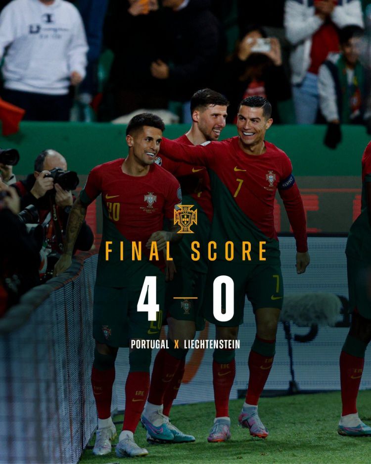 【比赛战报】欧预赛-C罗里程碑战点射+任意球完成双响葡萄牙4-0列支敦士登C罗连场任意球破门+梅开二度,坎塞洛、B席破门,葡萄牙主场4-0大胜列支敦士登。????梅开二度!C罗连场任意球破门,国家队197场