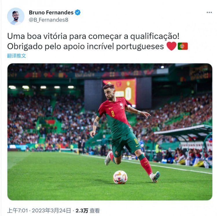 玩球网3月24日讯在北京时间今天凌晨进行的欧预赛中,B费首发出战,帮助葡萄牙主场4比0大胜列支敦士登。赛后B费在社交媒体上晒出自己的比赛照片,并写道:“以一场很棒的胜利开启欧预赛征程!感谢葡萄牙球迷令