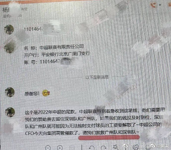 玩球网3月24日讯据记者程文莉报道,中超公司的CFO正在向集团高管催款,以拯救陷入困境的广州队和深圳队。 程文莉透露,广州队就差2000万过准入关,而深足的资金窟窿要大很多很多,雪上加霜的是,深足一直拖欠两家中超俱乐部和两家国外俱乐部的球员转会费,其中就包括拖欠广州队一笔数千万的转会费,涉及的球员是上赛季的队长李源一。 如果广州队能从深圳队拿到4000万元的转会费,那么不仅可以解决准入关,甚至可以帮广州队解决新赛季的部分运营资金。可是问题是,深足最差的就是钱。 不过两队的命运也迎来了转会,中超公司和中超赞助商站了出来,程文莉晒出了中超公司CFO请求集团高管打款的聊天截图,内容如下: “这个是2022年中超的尾款,中超联赛特别着急收到这笔钱,他们需要用我们的赞助费去留住深圳队和广州队,如果我们的钱没及时到位,深圳队和广州队就可能因为无法按时支付球员的工资要解散了。 ” (德里森) |