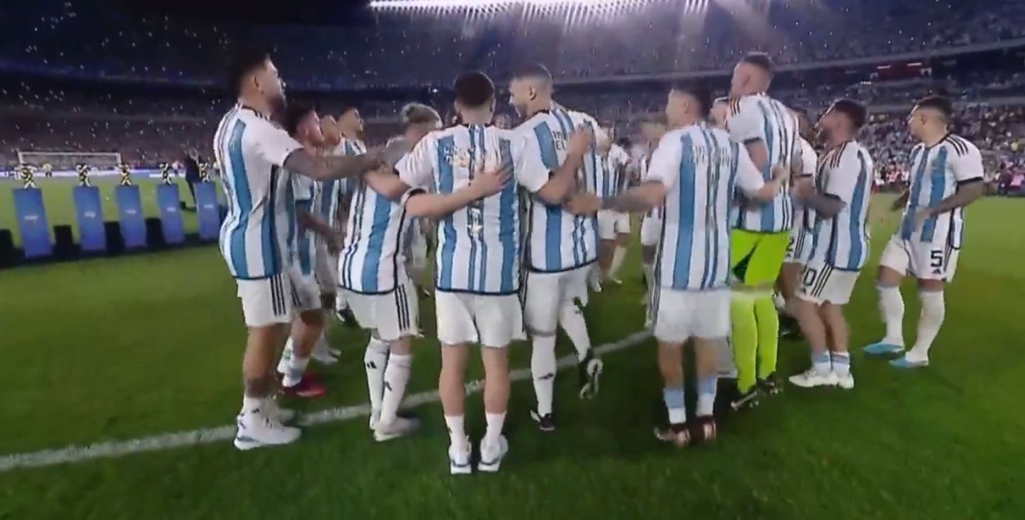 玩球网3月24日讯赛后阿根廷全队围成圈高唱,庆祝世界杯冠军