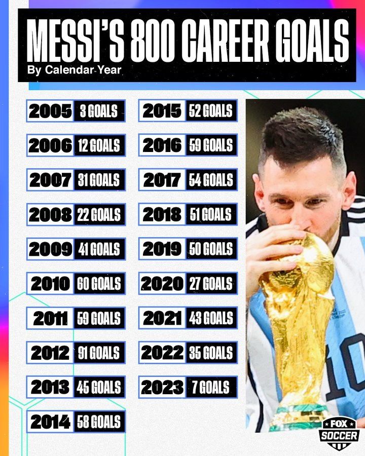玩球网3月24日讯今天,阿根廷在友谊赛中2-0击败巴拿马,梅西任意球破门解锁生涯800球里程碑,福克斯体育统计了梅西职业生涯至今每一年的进球数,具体如下:2005年:3球2006年:12球2007年:
