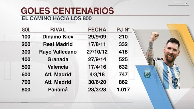 玩球网3月24日讯今天,阿根廷在友谊赛中2-0击败巴拿马,梅西破门解锁生涯800球里程碑,ESPN统计了梅西生涯至今每一个百球的对手和时间,具体如下:第100球:2009年9月29日对阵基辅迪纳摩,梅