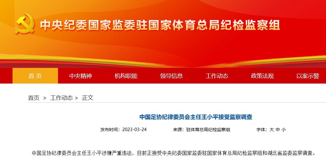 玩球网3月24日讯 官方消息,中国足协纪律委员会主任王小平涉嫌严重违法,目前正接受中央纪委国家监委驻国家体育总局纪检监察组和湖北省监委监察调查。 中国足协高层被查时间线: 2022年11月26日,原国足主帅李铁接受监察调查 2023年1月19日,中国足协执委、原秘书长刘奕接受监察调查 2023年1月19日,中国足协常务副秘书长兼国管部部长陈永亮接受审查调查 2023年2月14日,中国足协主席、党委副书记陈戌源接受审查调查 2023年3月23日,足协纪律委员会主任王小平、竞赛部部长黄松 |
