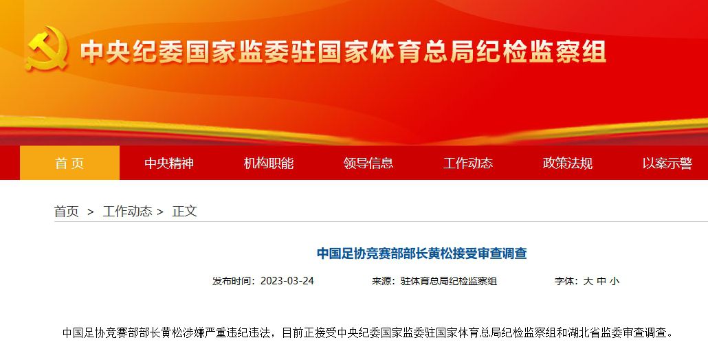 玩球网3月24日讯中国足协竞赛部部长黄松涉嫌严重违纪违法,目前正接受中央纪委国家监委驻国家体育总局纪检监察组和湖北省监委审查调查。据李璇透露,她曾在3月20日中午联系过黄松,当天晚上知道黄松被从足协1