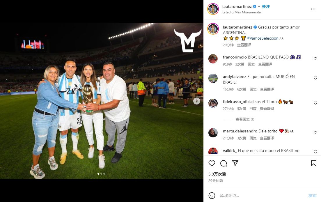 玩球网3月24日讯国米前锋劳塔罗更新个人ins,感谢在阿根廷得到的爱。阿根廷热身赛2-0击败巴拿马,这场比赛是球队夺得世界杯后首次在祖国亮相,阿根廷足协也为球员们举行庆祝仪式。赛后,劳塔罗更新社媒,他