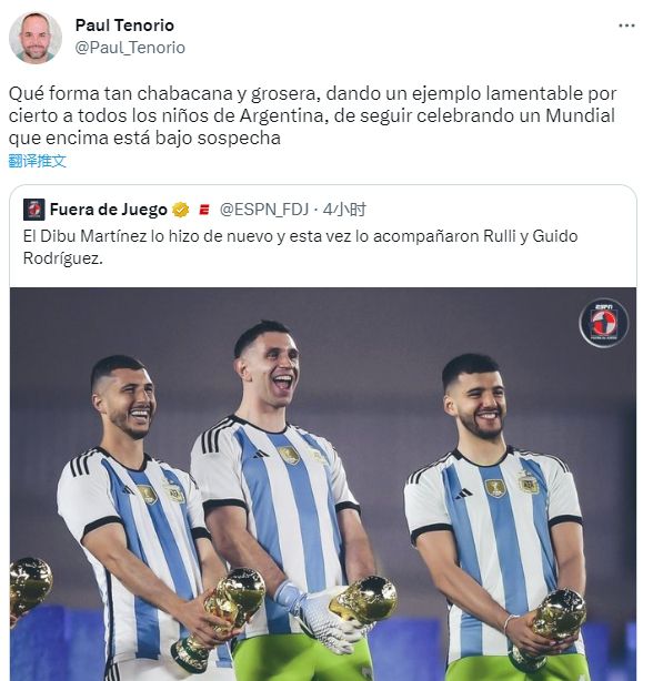 玩球网3月24日讯 马丁内斯在今日友谊赛赛后和队友一起重演了自己在世界杯上的粗俗庆祝动作。 西班牙记者Paul Tenorio在社媒批评到: 多么俗气和粗鲁的方式,就继续这样庆祝一个被质疑的世界杯冠军。这给所有阿根廷孩子树立了一个糟糕的榜样。 |