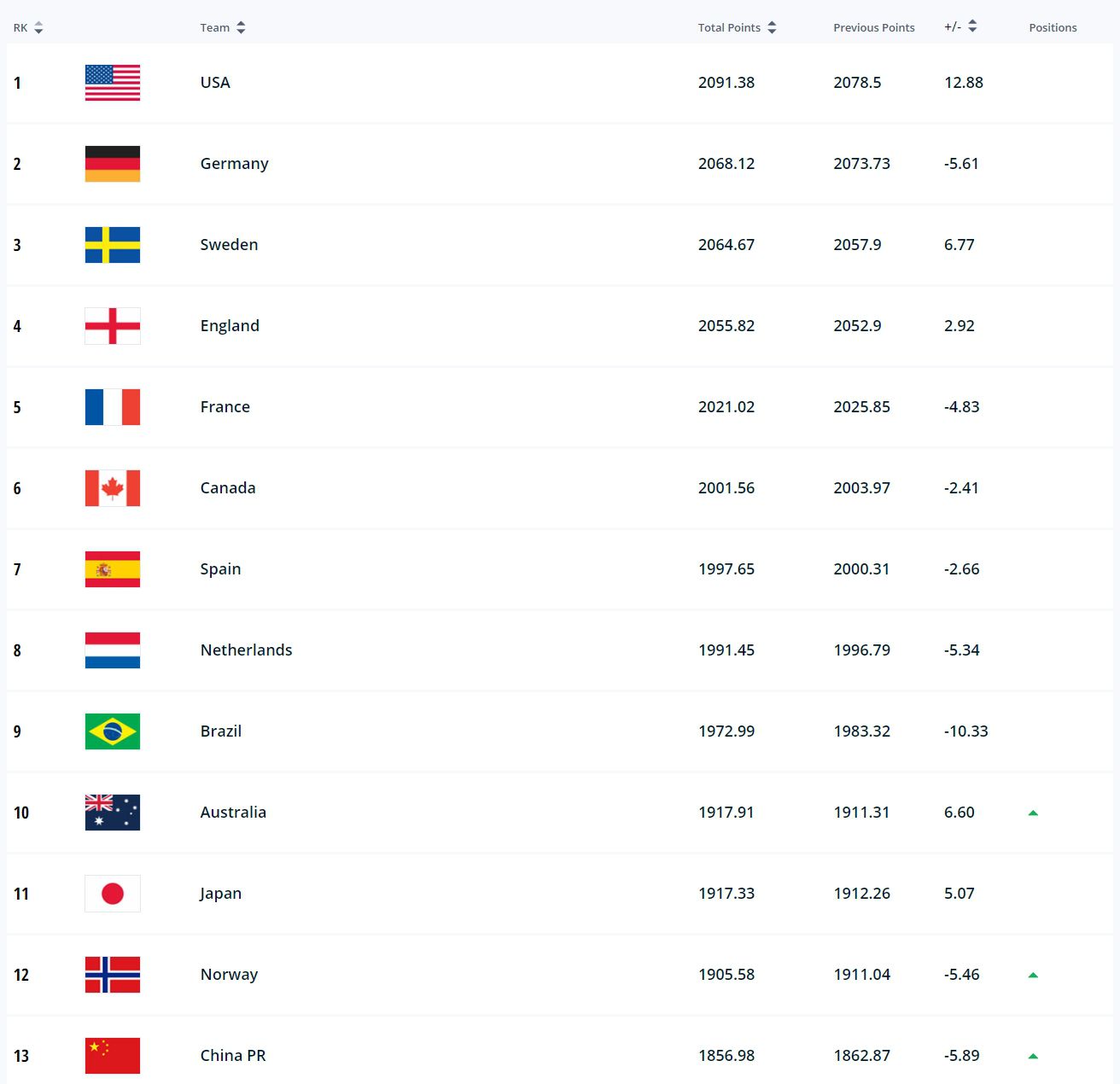 玩球网3月24日讯FIFA公布最新一期女足世界排名,中国女足上升一位至第13位,排名亚洲第三。朝鲜女足因为4年多没有进行正式比赛,被移除出排名系统。上一期女足世界排名中,朝鲜女足排名第10位,亚足联第