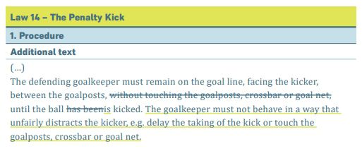 玩球网3月24日讯国际足球协会理事会(IFAB)官宣新赛季规则更改,其中对门将面对点球时的行为进行了更严格的规范。新规将在7月1日实行。规则写道:“防守点球时,守门员必须保持在球门线上门柱间,面对踢球