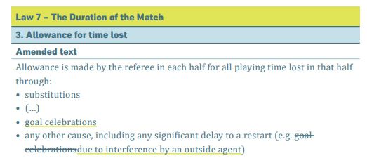 玩球网3月24日讯国际足球协会理事会(IFAB)官宣足球新规,新规中对比赛上下半场补时时间的组成有了新的描述。新规将在7月1日正式实行。裁判应在制定补时时间时考虑以下比赛事件↓——替补换人——进球庆祝