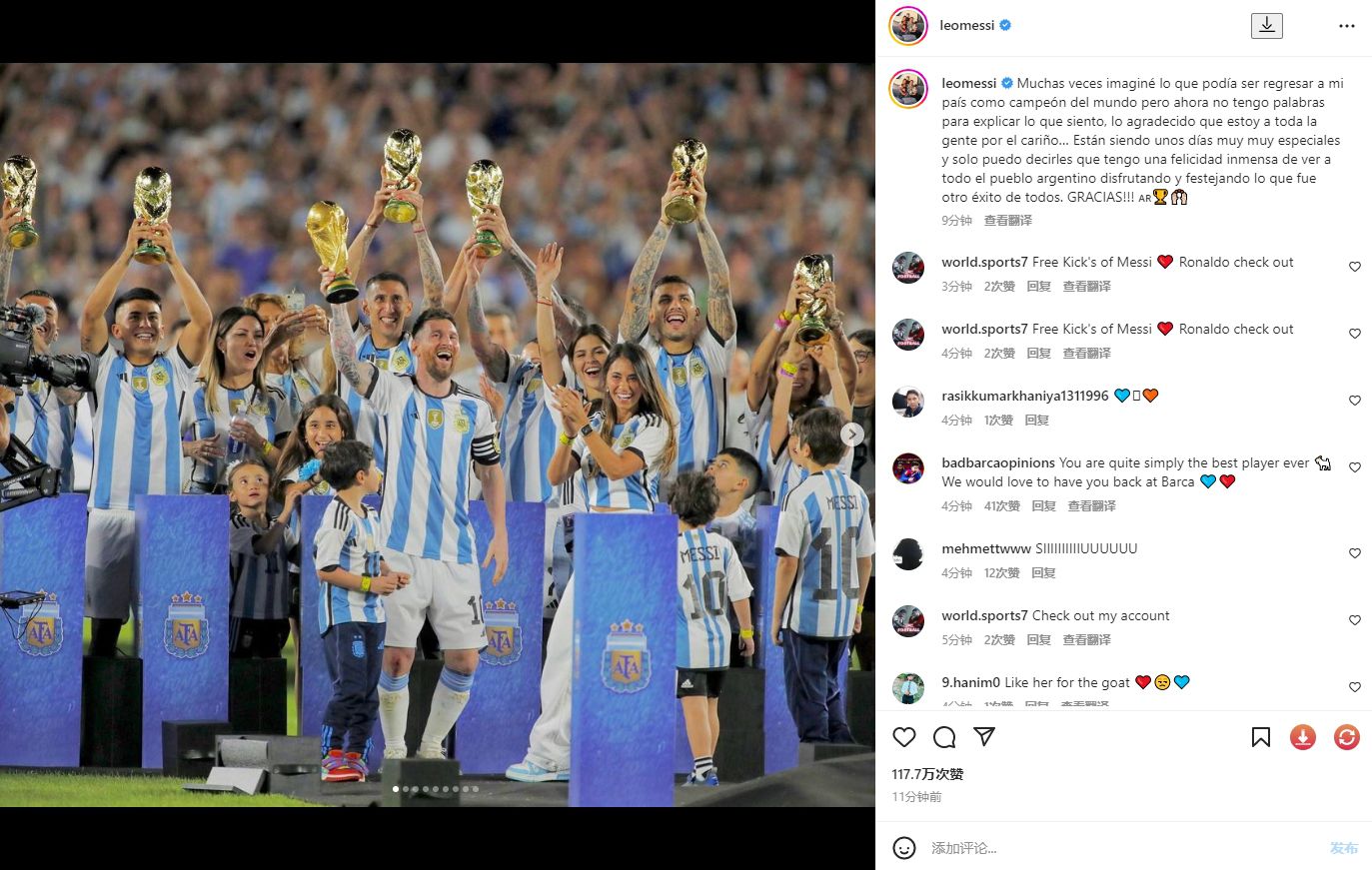 玩球网3月24日讯在阿根廷vs巴拿马的赛后,阿根廷队举行庆典庆祝世界杯夺冠。今天梅西社媒发文:“我想象过很多次以世界冠军的身份回到我的国家会是什么样子,但现在我无法用言语来解释我的感受,我是多么感激所