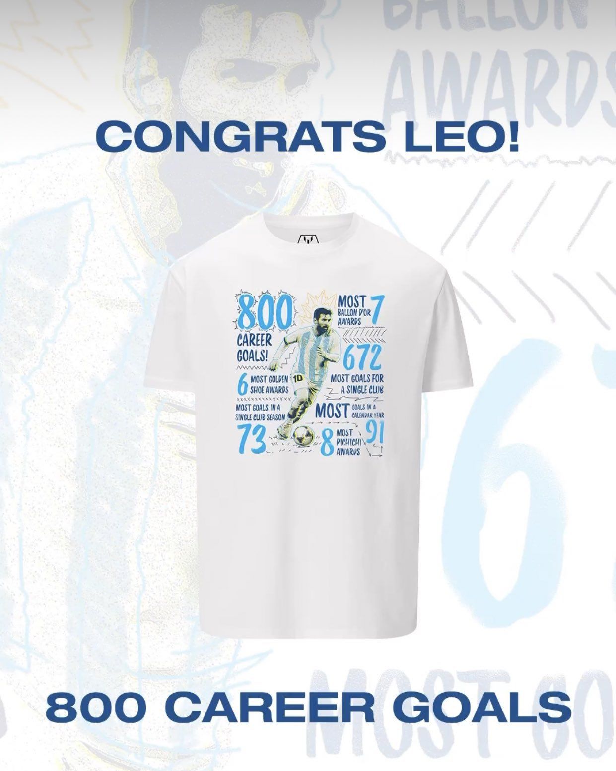 玩球网3月25日讯在友谊赛阿根廷2-0击败巴拿马的比赛中,梅西打进了1粒任意球,那也是梅西个人生涯的第800球里程碑。梅西的个人品牌推出了一款梅西800球的里程碑纪念衫,在这件短袖的前面,印有梅西生涯