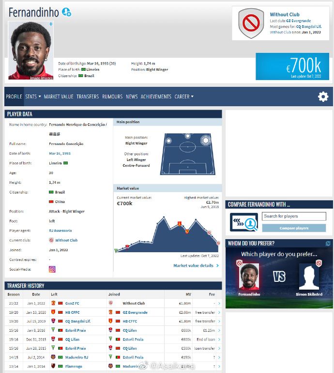 自从2022年初和广州队解约后起“小摩托”费南多就一直处于自由身状态。加上此前的伤病等原因,他的最后一场比赛是2021年5月9日广州队2-0客场战胜沧州雄狮的比赛,那也是那一年他唯一出场的比赛。距今已经680多天了。 费南多目前仍为中华人民共和国公民且符合入选中国国家队资格。但总因为各种原因错过为中国队出场的机会。 |