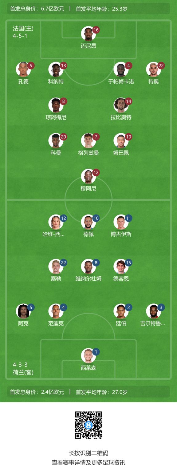 玩球网3月25日讯凌晨03:45,欧洲杯预选赛B组,法国迎战荷兰。赛前首发名单公布。法国队首发:16-迈尼昂、5-孔德、13-科纳特、4-于帕梅卡诺、22-特奥、8-琼阿梅尼、14-拉比奥特、7-格列