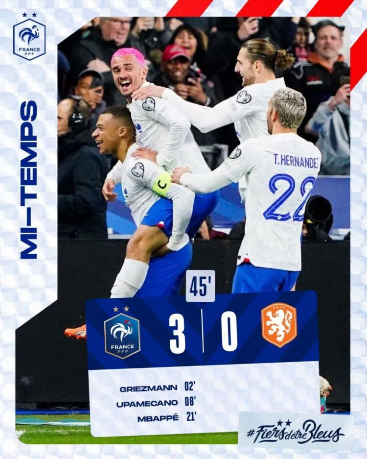 玩球网3月25日讯北京时间3月25日凌晨3点45,欧洲杯预选赛B组首轮,法国主场迎战荷兰。上半场比赛,格列兹曼开场2分钟闪击破门,于帕梅卡诺、姆巴佩建功。半场战罢,法国3-0荷兰。【比赛关键事件】第2