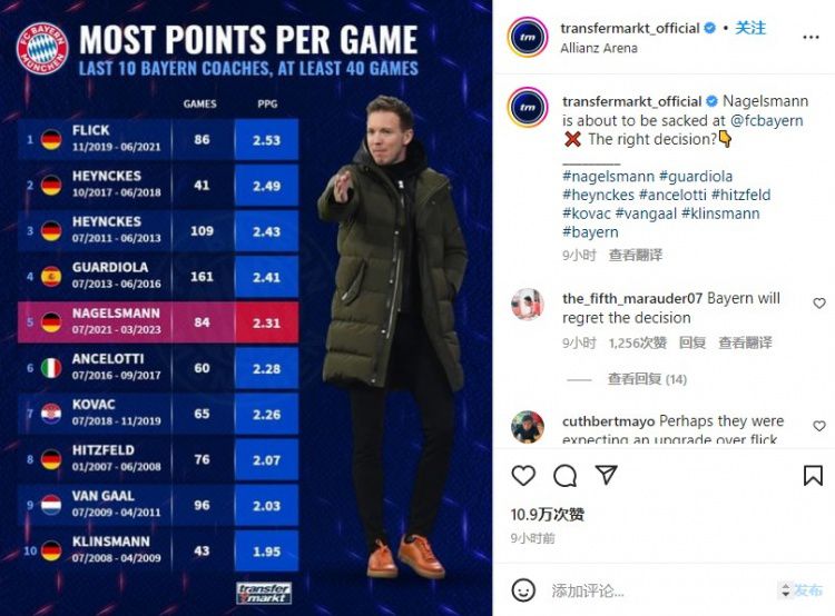 玩球网3月25日讯德国转会市场统计了拜仁近10位执教至少40场比赛的主帅战绩,纳格尔斯曼场均2.31分排名第五。拜仁近10位主帅战绩(至少执教40场):1、弗里克,2019年11月至2021年6月,8