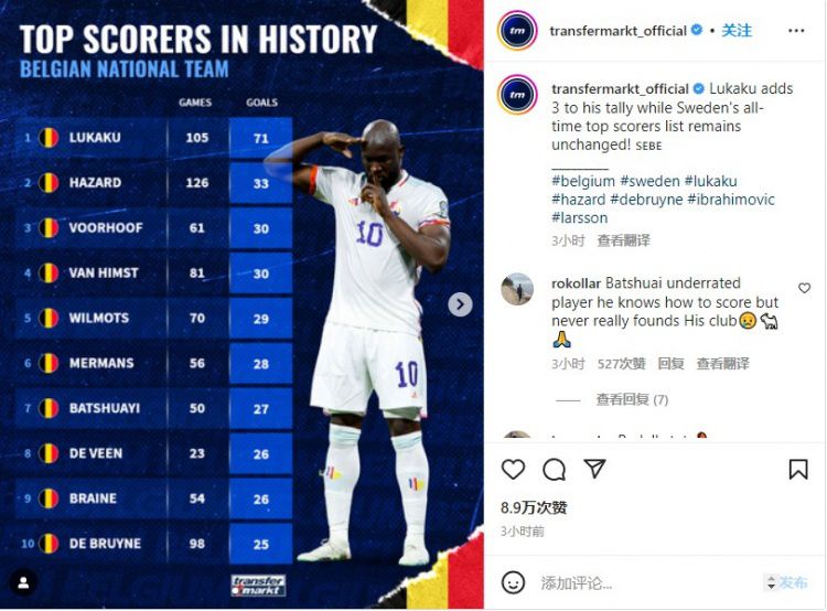 玩球网3月25日讯今天凌晨,比利时3-0击败瑞典,卢卡库完成帽子戏法,德国转会市场统计了比利时国家队历史射手榜。比利时国家队历史射手榜:1、卢卡库,105场71球2、阿扎尔,126场33球3、沃尔霍夫