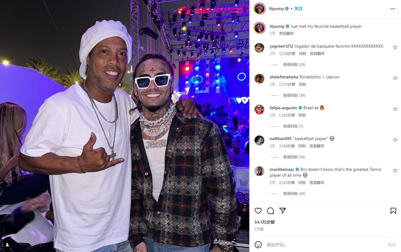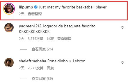 玩球网3月25日讯美国说唱歌手lilpump在ins分享了一张和小罗的合影,并配文:遇到了我最喜欢的篮球运动员。不知lilpump是真不认识小罗还是故意耍宝,评论区也都趁势开起了玩笑。有评论说:小罗>