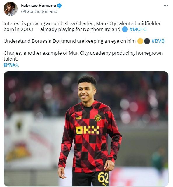 玩球网3月25日讯据意大利记者罗马诺的消息,多特正在关注19岁曼城青训中场查尔斯(SheaCharles)。罗马诺指出,曼城U21梯队队长查尔斯吸引了外界的兴趣,他已经为北爱尔兰国家队出场,多特正在关
