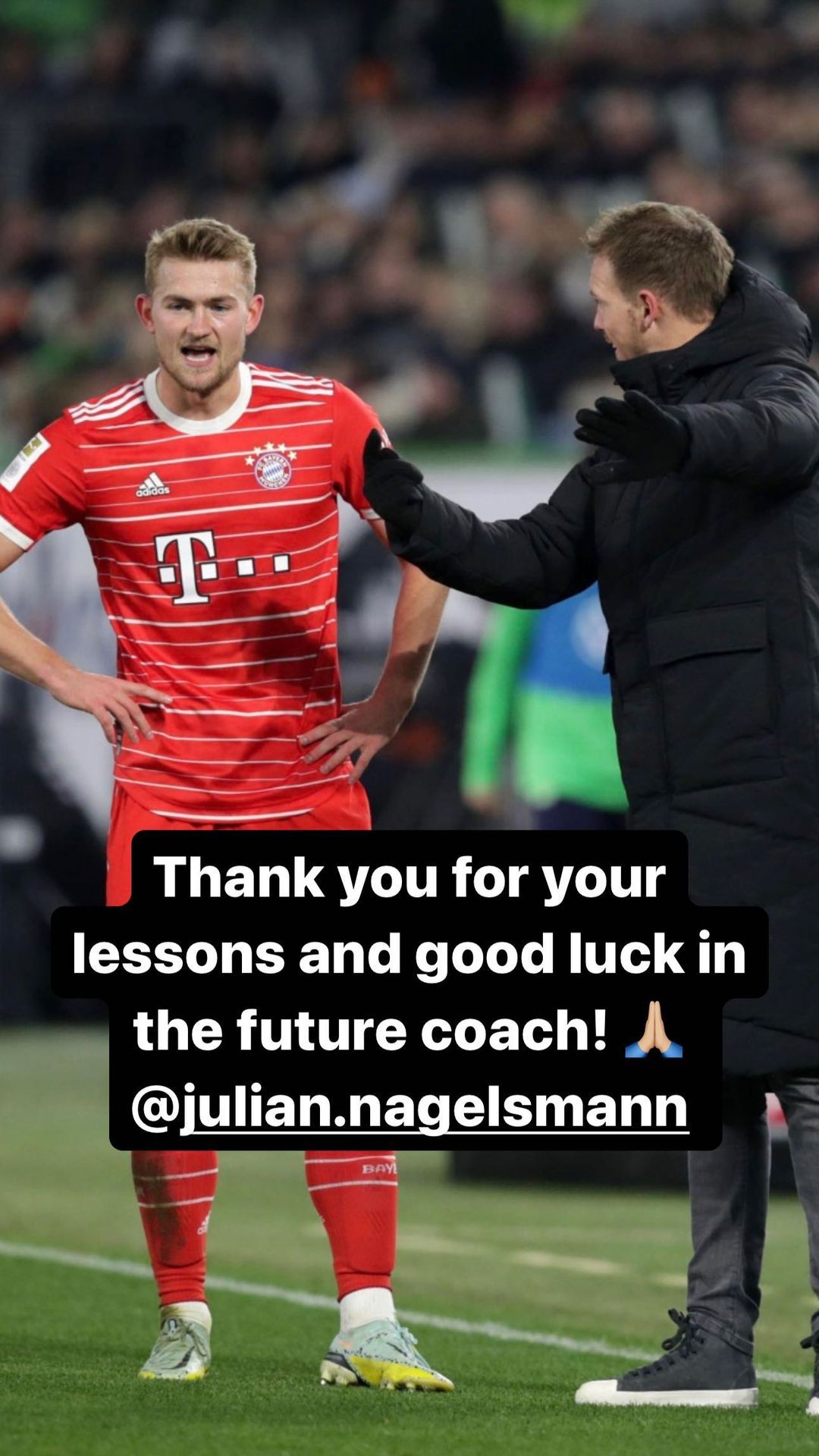 德里赫特上传了与纳格尔斯曼的合影,并配文写道:“感谢你的指导,祝你在未来一切顺利,教练!”