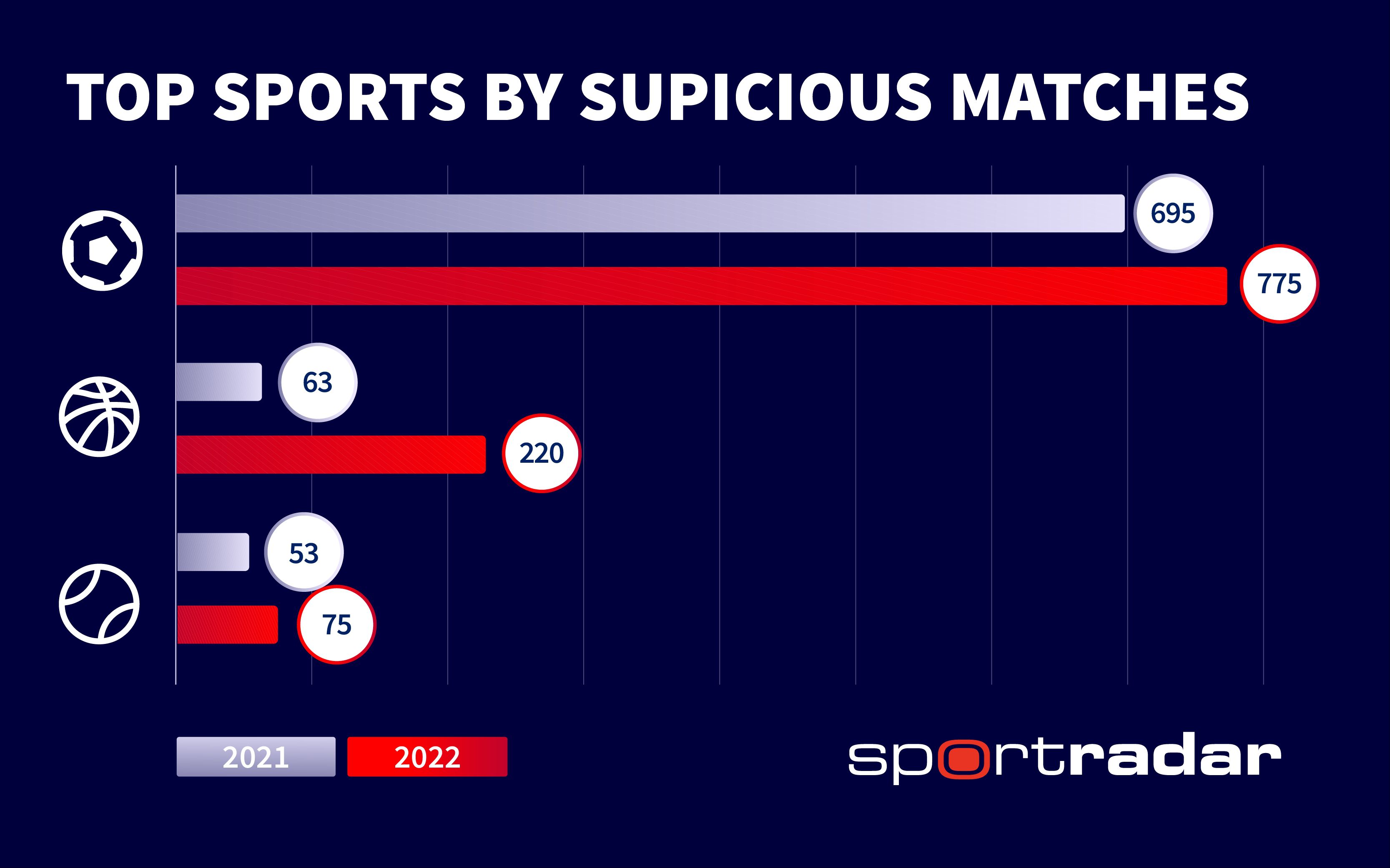 玩球网3月25日讯数据机构sportradar最近发布了一份报告,报告通过深度数据检测系统以及AI,检查了2022年超过85万场的体育比赛,分析其中有哪些比赛涉及假赛以及博彩操控。85万+场比赛中,有