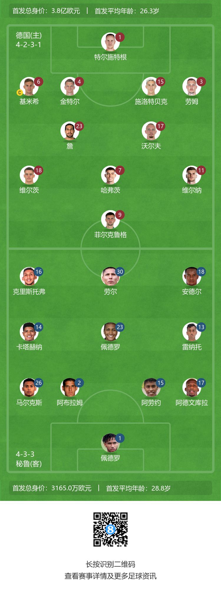 玩球网3月26日讯北京时间今天凌晨3:45,国际足球友谊赛,德国主场对阵秘鲁。赛前,官方公布了本场的首发名单。德国首发:1-特尔施特根、3-劳姆、4-金特尔、15-施洛特贝克、17-沃尔夫、6-基米希
