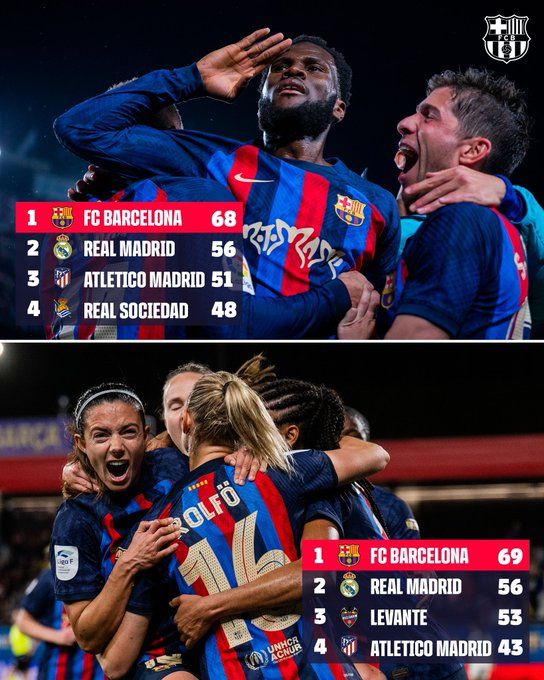 至此,巴萨男足、女足先后在西班牙国家德比中取胜,双双登顶积分榜榜首。