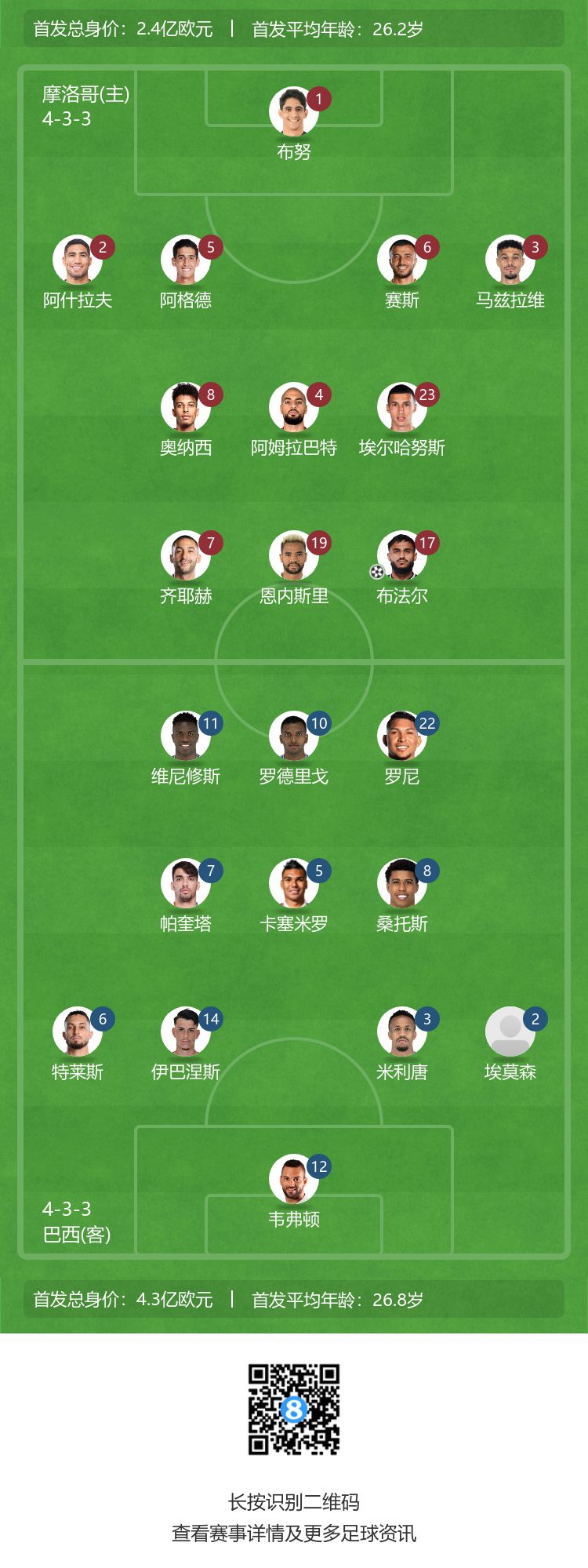 玩球网3月26日讯 北京时间今天早上6:00,国际足球友谊赛,巴西客场对阵摩洛哥。赛前,官方公布了本场的首发名单。 巴西首发:12-韦弗顿、2-埃默森、3-米利唐、14-伊巴涅斯、6-特莱斯、5-卡塞米罗、8-安德烈-桑托斯、7-帕奎塔、10-罗德里戈、11-维尼修斯、22-罗尼 巴西替补:1-埃德森、23-迈凯尔、4-布雷默、9-尤里-阿尔贝托、13-阿图尔、15-罗伯特、16-洛迪、17-安德烈、18-若奥-戈麦斯、19-罗克、20-维加、21-安东尼 摩洛哥首发:1-布努、2-阿什拉夫、3-马兹拉维、5-阿格尔德、6-塞斯、4-阿姆拉巴特、8-欧纳希、23-汉努斯、7-齐耶赫、17-鲍法尔、19-恩内斯里 摩洛哥替补:25-阿蒂亚特、13-伊姆兰、11-萨比里、21-切迪拉、16-阿布德、18-亚米克、14-阿布赫拉尔、15-阿布德尔、26-阿尤布、22-梅赫迪、24-本杰明、20-达里、99-易卜拉欣-萨拉赫、98-亚希内、10-扎鲁里、82-哈姆达拉、12-穆尼尔、91-沙迪-里亚德 (夜神) |