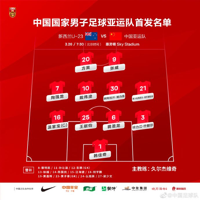 玩球网3月26日讯友谊赛,中国男足亚运队对阵新西兰U22,赛前首发公布。国足亚运队首发:1-韩佳奇、16-温家宝、25-王献钧、6-蒋圣龙、3-叶力江-什那尔、7-陶强龙、30-阿布拉汗、21-阿卜杜