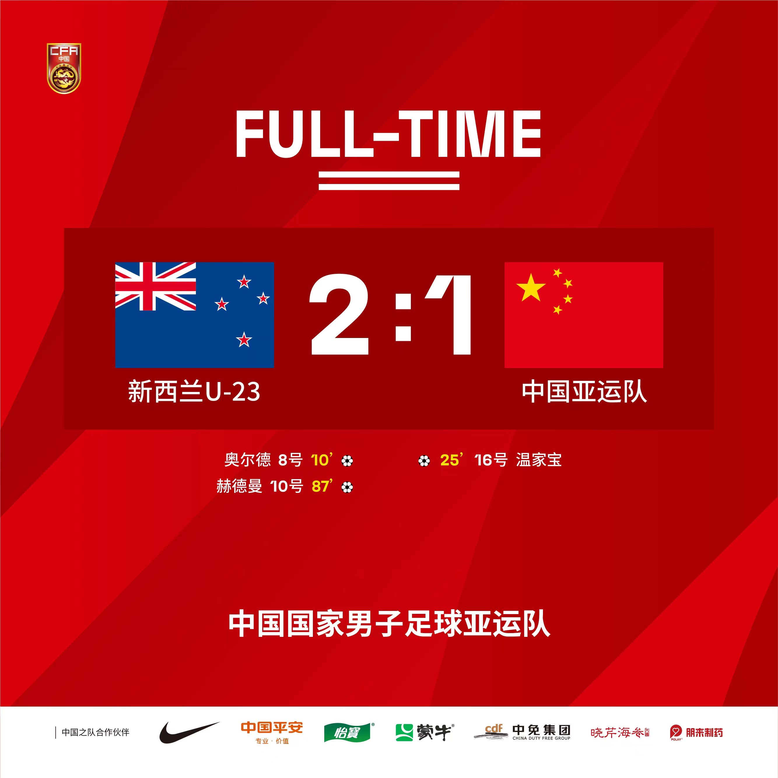 在刚刚结束的国际足球友谊赛中,中国国家男子足球亚运队1:2负于新西兰U-23国家男子足球队。比赛第10分钟,新西兰队率先破门,取得领先。第25分钟,中国队边路传中造成威胁,队长温家宝禁区内射门得分,将
