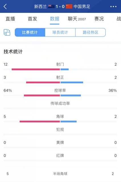 射门(射正):新西兰12次射门3次射正,国足2次射门2次射正