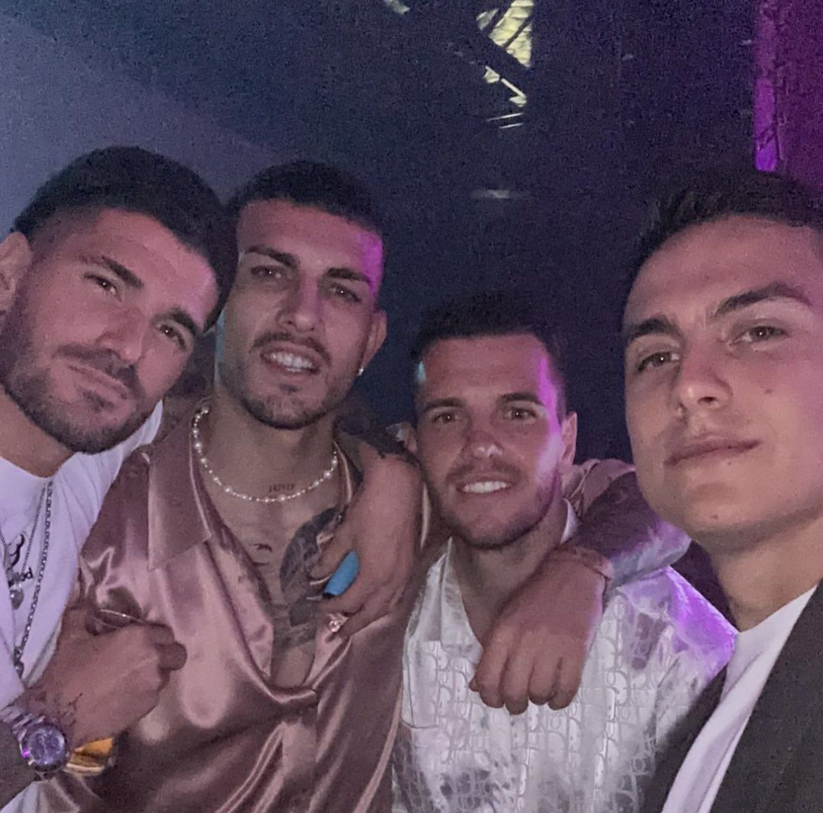 阿根廷队派对合照:梅西、天使蹲立在旁,大马丁躺地C位