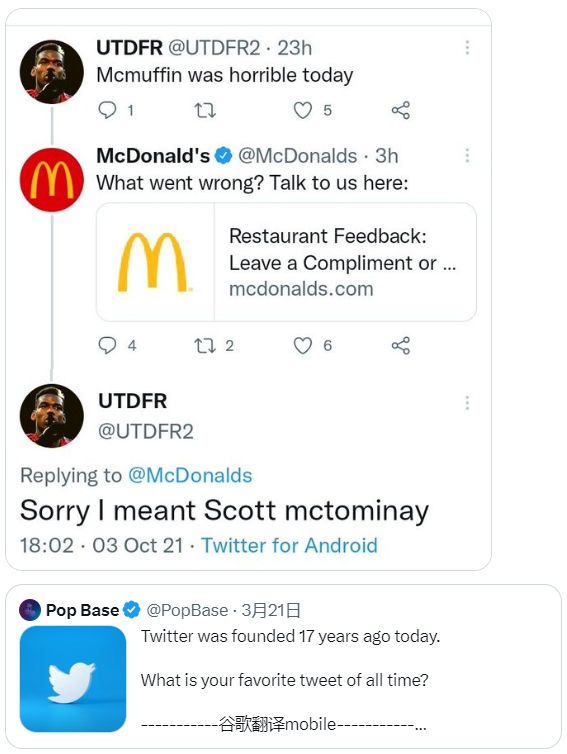 玩球网3月26日讯 近日,推特成立17周年,社交媒体上有一项名为“你最喜欢的推文”的话题。一名曼联球迷晒出了自己2021年10月的一条动态。 当时曼联主场1-1战平埃弗顿,他在社媒写道:“今天的麦满分太可怕了”(注:mcmuffin意为松饼,是麦当劳餐点之一,球迷利用谐音吐槽麦克托米奈) 麦当劳官方误以为是在吐槽麦当劳,回复他:“发生什么了?请在这里告诉我们”,并附上了反馈链接???? |