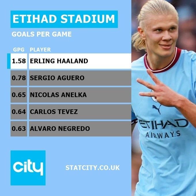 【????】哈兰德曼城生涯在阿提哈德球场场均1.58球,为队史效率最高,队史第二是阿圭罗的0.78球