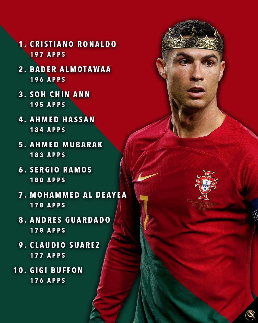 玩球网3月26日讯环足奖官方统计了球员在国家队出场的次数,并列出榜单,C罗以197次居首,拉莫斯180次排名第6位。国家队历史出场榜:C罗(葡萄牙)——197阿尔穆塔瓦(科威特)——196苏进安(马来