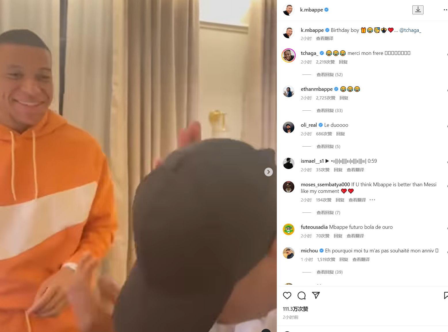 玩球网3月26日讯 姆总更新社媒,为他的朋友Brice Tchaga送上了生日祝福,并分享了他们在一起嬉闹的视频和合照↓