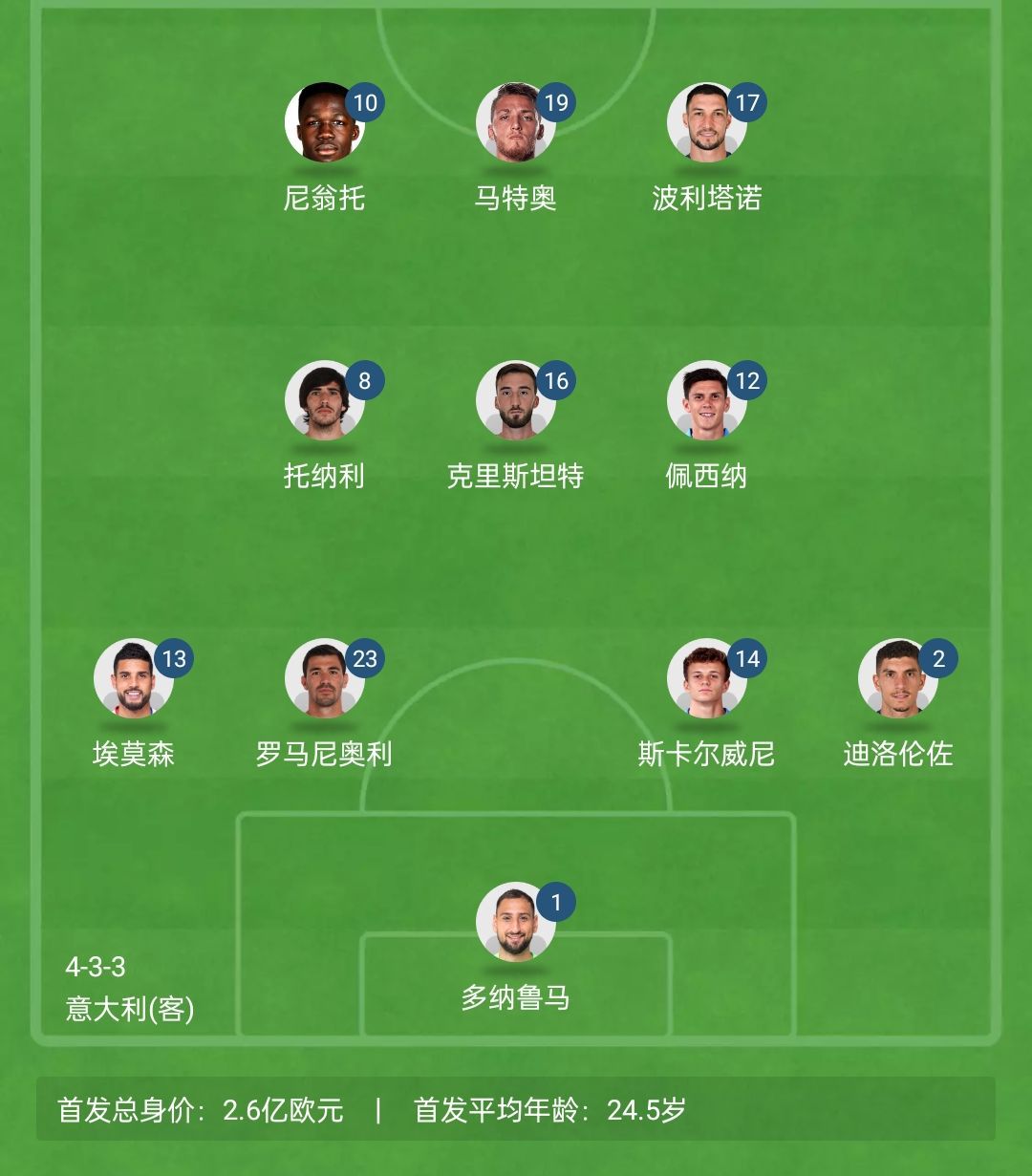玩球网3月27日讯欧洲杯预选赛C组,意大利对阵马耳他。赛前,官方公布首发名单。意大利首发:1-多纳鲁马、13-埃莫森、23-罗马尼奥利、14-斯卡尔威尼、2-迪洛伦佐、20-托纳利、16-克里斯坦特、
