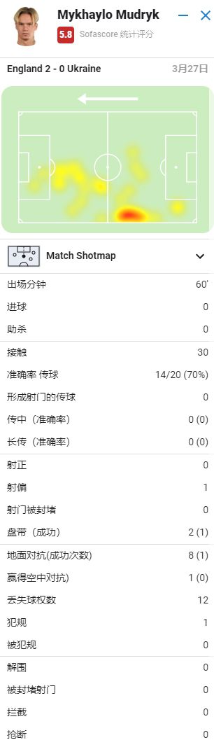 玩球网3月27日讯欧洲杯预选赛C组,英格兰vs乌克兰,乌克兰边锋穆德里克本场表现不佳,在第60分钟被替换下场,下场时他的评分为5.8分,全场最低。详细数据如图↓